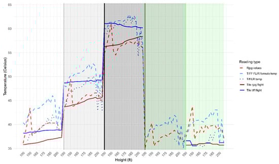 Two total flights were conducted over the three tiles and two grass locations on either side of the tiles (Figure 2). The thermal camera was set to record rjpg files during the first flight and to record tiff files during the second flight. Per flight, six different height levels were investigated at 30.5 m (100 ft), 45.7 m (150 ft), 50.3 m (165 ft), 53.3 m (175 ft), 56.4 m (185 ft), and 61.0 m (200 ft). At each flight level, three of the clearest images were chosen that represented the full duration the UAV hovered at that height (i.e., one image was chosen near the beginning of the time the UAV moved to that height, then one in the middle of the time, and one more from near the end before it transitioned to the next height). This resulted in 180 total observations (5 ground-truth objects × 2 flights × 6 height levels × 3 images per height), or 36 observations per ground-truth object. At each height level, tile readings were recorded on an SD card, and the handheld FLIR camera was used to obtain independent readings of the top of each tile, plus readings of the grass on either side of the tiles. This totaled 60 handheld observations (5 ground-truth objects × 2 flights × 6 height levels).