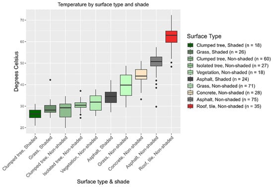 Manmade surfaces were expectedly hotter than live, natural surfaces (i.e., the grass). Pine straw, a natural but dead material, exhibited high temperatures near the level of asphalt (Table 6). In order to examine additional surface types and to extend measurements past the areas publicly accessible by the handheld camera on the ground, 50 random points were created for each of the 10 streets/thermal images (n = 500), and the UAV camera temperature readings were extracted. Figure 7 shows the distribution of readings by surface types for all types that totaled more than 15 random sample points. The results continue to support the findings in Table 6 in which live natural surfaces, even when non-shaded, tend to be cooler than manmade surfaces. Trees that existed in forested or clumped conditions showed the coolest temperatures in comparison to trees that existed in isolated conditions.