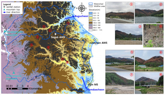 The wildfires predominantly occurred at elevations between 50 m and 300 m. The area damaged by the wildfires in the Bugucheon watershed was 24.6 km2, accounting for 45.1% of the total area. The Namdaecheon watershed, with a damaged area of 34.4 km2 and 27.0%, showed a smaller wildfire intensity than the Bugucheon watershed. The rainfall measurement stations and mountainous tops are depicted in the topographic map in Figure 2. As shown in the wildfire evidence photos (①–⑧) in Figure 2, the mountain ridges dominated by Pinus densiflora at an elevation of 100 m~300 m were damaged by the crown fire that burned even the tops of the trees. The middle hillslopes showed a stem fire, with charred trunks of trees. The lower slopes near the river, where many oak trees live, had relatively less fire damage than the upper slopes, where many pine trees live. As indicated on the map in Figure 2, there are three rainfall observation points at distances of approximately 10 km within the study area. The two points located in Sogok and Jukbyeon are the automatic weather system (AWS), and the one point located in Uljin is the meteorological station (MS).