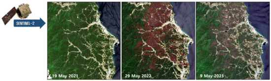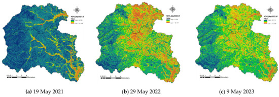 The cover factor of the RUSLE and the vegetation index of the SEMMA were extracted from satellite images. The satellite images with a 10 m resolution were acquired, as shown in Figure 3, to identify the vegetation cover before and after the Uljin wildfire in March 2022. Information on the location and scale of the wildfire damage was obtained from the images from 2021 and 2022. From the changes in the images from 2022 and 2023, it is possible to understand the recovery and secondary management of the vegetation after the wildfire. The NDVI is an index that evaluates the vitality of vegetation using the property that plant leaves reflect more near-infrared rays than soil [52]. Its value varies between -1 and 1, where low values can be found at water bodies, in bare soil, and in built-up areas. The NDVI is positively corrected with the amount of green biomass, so it can be used to give an indication of the differences in green vegetation coverage.