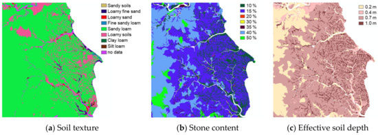 Distribution maps for soil texture (a), stone content (b), and effective soil depth (c).
