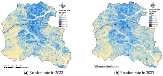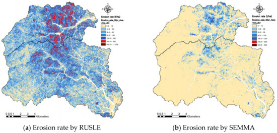 The rainfall erosivity factor determined by Brown and Foster (2002) [48] was in the range from 392.1 to 666.2 J/m/h for a 50-year and 80-year probability of rainfall. The distribution of the soil erodibility factor, K, showed small values in areas with a high stone content above a 500 m altitude and high values of 0.50 t/ha/unit R in agricultural lands near waterside. The slope and length factors (LS) are dependent on the slope angle and showed a range from 0.03 to 9.34. The cover and practice factor (CP) followed the following order: bare land > agricultural land > wildfire area > forest land. The erosion rate of the RUSLE was simulated using Equation (1) based on GIS, as shown in Figure 6.