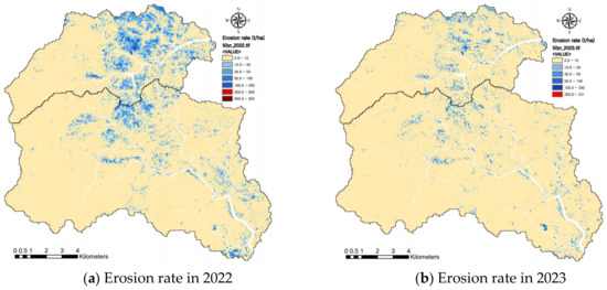 The simulation results of the RUSLE for a probability of rainfall with a 50-year and 80-year frequency showed that moderate erosion (>10 t/ha and <50 t/ha) extended over a wide area in the Bugucheon and Namdaecheon watersheds in 2022 and 2023 after the wildfire (Figure 8a,b). The level of high and very high erosion (>50 t/ha) increased with increasing the probability of rainfall and decreased from 2022 to 2023 after the fire. A very high erosion rate (>200 t/ha) was seen in developing bare slopes such as quarries, construction, and transmission towers and on the artificial bare slopes of roadsides and riversides as well as steep hillslopes damaged significantly by the wildfire. As a result of an RUSLE simulation for a basin in Attica, eastern Greece [18], the post-fire erosion rate was significantly higher overall, ranging from 4.53 to 5.98 t/ha/yr, and areas disturbed by development showed higher erosion rates of 3.75~18.58 t/ha/yr. The RUSLE has shown high erosion rates (265 t/ha/yr) on steeper slope parts, even in non-fire watersheds [33]. The erosion rates estimated in the Uljin wildfire watersheds were relatively high, as more than 70% of the hillslopes are steep slopes. The erosion rate of the SEMMA, which is less susceptible to topographical factors, showed that low erosion (<10 t/ha) occupied the largest area in the Bugucheon and Namdaecheon watersheds, as shown in Figure 9. High erosion rates (>50 t/ha and <200 t/ha) were predominantly observed in steep hillslopes damaged by the 2022 wildfire (Figure 9a,b). The erosion rate decreased generally in 2023, one year later, rather than in 2022, the same year after the fire.