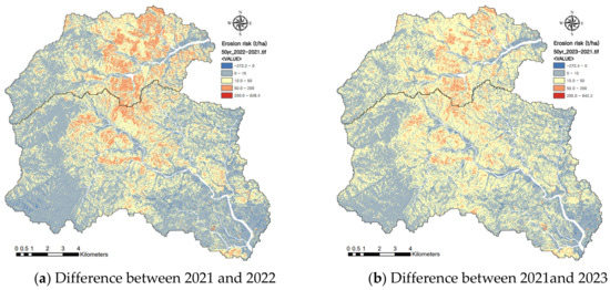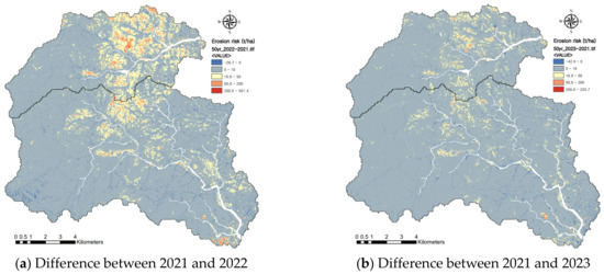 The erosion risk aggravated in the watersheds due to the wildfire was evaluated by comparing the amount of erosion before and after the wildfire. The evaluation of the erosion risk using the RUSLE and SEMMA was conducted for a 50-year and 80-year probability of rainfall events and for the post-fire years of 2022 and 2023. The erosion risk evaluated by the RUSLE increased most significantly for an 80-year probability of rainfall in 2022 immediately after the wildfire. Figure 10 shows the changes in erosion risk estimated by the RUSLE for a 50-year probability of rainfall according to the elapsed years after the wildfire. The erosion risk of a high erosion degree (>50 t/ha) greatly increased in 2022 and decreased according to the elapsed years after the wildfire. The extent of moderate erosion (>10 t/ha and <50 t/ha) in 2023 increased significantly compared to 2022. May is a time when the vitality of natural vegetation increases rapidly. The satellite image in 2023 was acquired on 9 May, which is approximately 10 days earlier than the image acquired on 19 May 2021, and approximately 20 days earlier than the image acquired on 29 May 2022. In other words, it was judged that the vegetation vitality in 2023 would have been relatively low compared to 2021 and 2022. This is the reason why the risk of erosion increased by more than 10 t/ha on the non-fire steep slopes (Figure 8 and Figure 10b). Therefore, it is necessary to acquire high-quality satellite images and accurate data assimilation in the analysis of noisy time series.