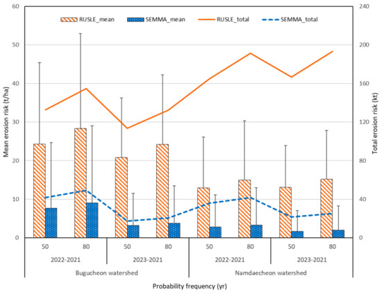 Comparison of statistical results of erosion rates simulated by TVs of RUSLE and SEMMA for Bugucheon and Namdaecheon watersheds according to the year and probability of rainfall.