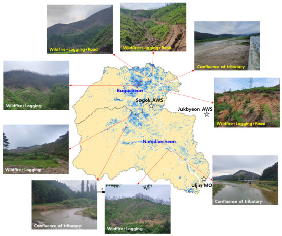 Recently, the history of large-scale wildfires around the world is being rewritten. The 2020 Australian wildfire was recorded as one of the largest wildfires in the world, with a damaged area of 18.6 million hectares [1,2]. Another the mega wildfire occurred in Canada in 2023, damaging a total of 18.5 million hectares [3]. The main natural causes of these expanded wildfires were extreme weather events such as lightning strikes, prolonged drought, high temperatures, heat waves, and strong winds [4,5,6]. The severity of international large-scale wildfires due to climate change has increased extraordinarily since entering the 21st century [7,8,9,10], and it is predicted that it will become more serious in the future [11]. Although it was relatively small compared to the scale of global wildfires, the second-largest wildfire in Korean history occurred in Uljin in 2022 [12]. Large-scale wildfires increase toxicity and carbon dioxide emissions and deteriorate soil, water, and air quality in remote areas [2]. Furthermore, if heavy rain occurs in wildfire areas, the risk of flooding increases, and it is difficult to avoid subsequent sediment disasters as a result of excessive erosion and landslides [13,14]. However, the intensity and frequency of extreme rainfalls are expected to increase further as large-scale wildfires gradually increase due to climate change [15,16,17].