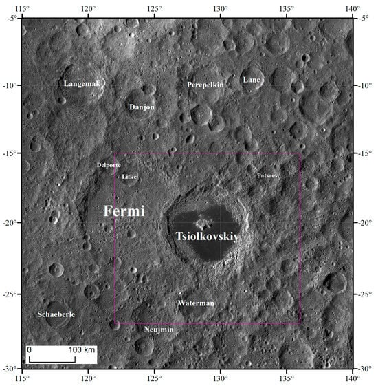 The Tsiolkovsky crater formed in the late Imbrian epoch at approximately 3.8 Ga [6]. It is one of the youngest complex craters on the farside of the Moon. The Tsiolkovsky crater has a complete structure (Figure 1) with an average rim diameter of approximately 180 km [13] and an average depth of approximately 4 km. It is centered at 129°E, 20°S and has a very prominent central peak approximately 1.7 km above the crater floor. The ejecta material of this crater is radially distributed around the rim of the crater, which has an irregular edge and is a typical central peak crater on the farside of the Moon. The crater has a smooth and dark floor covered with mare basalts. The crater is located in the low-latitude region of the southern hemisphere and is part of the anorthositic highlands tectonic unit [14]. Before the Tsiolkovsky impact, the Aitkenian Fermi basin had already produced thick ejecta materials at the target site, after which the Patsaev, Waterman, and Neujmin impact craters were formed in the Nectarian period and Litke impact crater was formed in the early Imbrian epoch; these craters also contributed to the target materials of the Tsiolkovsky impact.