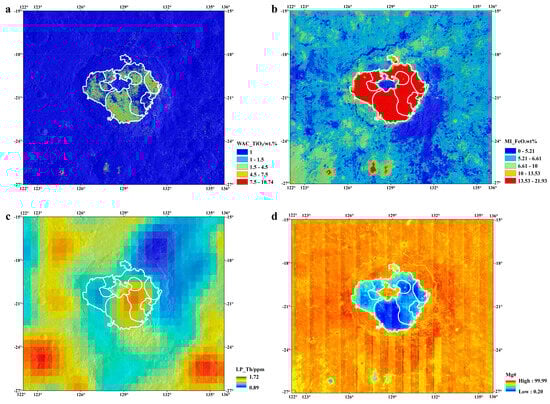 Chemical maps of the study area. (a) WAC TiO2 abundance (wt.%) map; (b) MI FeO abundance (wt.%) map; (c) Th map from the LP GRS data; (d) Mg# (100 × MgO/(MgO + FeO)) map using data from Liang Zhang et al. [19].