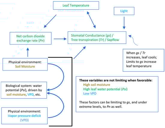 Diagram of the influence of environmental factors (soil moisture, vapor pressure deficit) and resources on physiological responses relevant to detection of foliar or crown temperature. Factors are color coded by groups—atmospheric, soil, and plant.