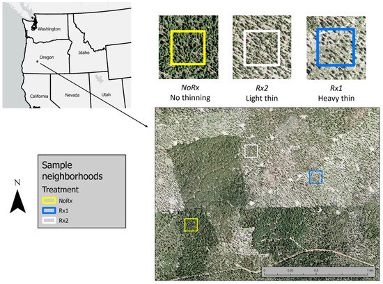 We selected groups of dominant trees in each treatment type that were free of crown or bole defects and were also within ca. 60 m of each other, which was a prerequisite for connecting the sapflow equipment to a single data logger. These study sites, or ‘neighborhoods’, are shown in Figure 2. Pre- and post-treatment stand and tree metrics are given in Table 1. Ocular estimates of PP canopy cover are Rx1—15–20%, Rx2—40–60%, and NoRx—75–80%. The objective of the LOMS was to lower the risk of stand replacing wildfire risk by reducing understory fuel loads and stand density. The silvicultural prescriptions specified a preference for retention of fire and drought-resistant PP (e.g., large, mature trees) and for removal of lodgepole pine, grand fir, and white fir [9].