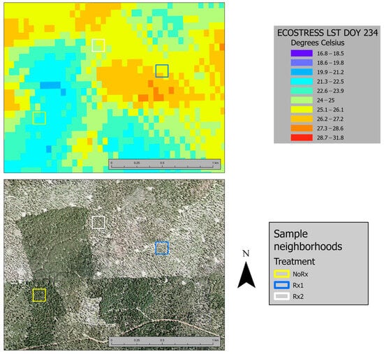 The temperature trends were reversed for Tes and Td; the highest Tes neighborhood was Rx1, followed by Rx2 and NoRx, (Table 10), while for Td, NoRx was the warmest, followed by Rx2 and Rx1. Note the different spatial scales of the two metrics: Tes is land surface temperature across a 38 m × 69 m area and Td is averaged over the upper one-third of selected tree crown, with shadows and branch surfaces excluded. The scatterplot of Td vs. Tes captures the negative correlation between the two crown temperature measures and distinct grouping of the Rx types (Figure 6).