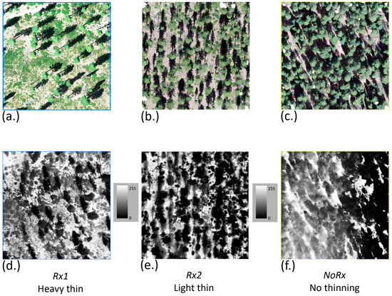 RGB orthomosaics of the 5-band 6 cm resolution MicaSense RedEdge MX imagery acquired on ca. 12:00 PDT (Pacific Daylight Time) on DOY 232 (a–c) for each of the neighborhoods, except for Rx1 (a) which was not flown with this sensor. The imagery in (a) is the Oregon Statewide Aerial Imagery Program 2018 orthophoto. The second row (d–f) displays mosaiced UAS thermal data from the FLIR instrument for each neighborhood. During the mosaic process, the 32-bit thermal tiles were converted to a single 8-bit orthomosiac image.