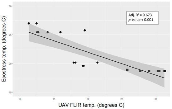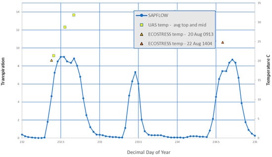 Air temperatures were extracted from existing data bases associated with the LOMS [9] and are given here for the purpose of comparing the weather conditions during the two-day data collection. Temperatures reported here were collected at each stand with an iButton temperature logger (DS-1922L Thermochron, Maxim Integrated Products, San Jose, CA, USA) mounted at 1.5 m above ground on fiberglass rods and sheltered from direct sunlight with inverted, feathered, plastic cup shades. Temperatures (°C) were recorded hourly for DOY 232 and 234. Averages for time of day approximating the UAV and ECOSTRESS collect times are presented in Table 2.