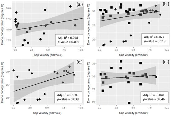 Scatterplots of UAV FLIR temperatures for tree crowns (Td) vs. sap velocity (Etrans) for day of year (DOY) 234 (a) and 232 (b–d). Note the variation in scale in the y-axes. Etrans values were matched temporally with the Td am, noon, and pm collect times, with a 1 h lag in compensate for sapflow friction [62]. Circles are Rx1 crowns, diamonds are Rx2, and squares are NoRx. (a) Rx1 DOY 234 (Rx1 was the only neighborhood flown with the FLIR instrument on DOY 234, n = 21), (b) all neighborhoods DOY 232, n = 39, (c) Rx2 DOY 232, n = 18 (d) NoRx DOY 232, n = 21. The Rx1 neighborhood was not flown with the FLIR instrument on DOY 232. The shaded areas are the 95% confidence intervals for each regression line.