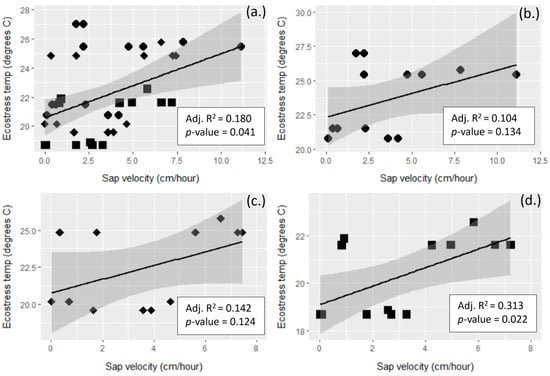 Tree transpiration (Etrans, y-axis) vs. ECOSTRESS crown temperature (Tes, x-axis) for both day of year (DOY) 232 and 234 combined. (a) All neighborhoods; (b) Rx1, heavily thinned; (c) Rx2, lightly thinned; and (d) NoRx, no thin. Circles are Rx1 crowns, diamonds are Rx2, and squares are NoRx. Etrans values were matched temporally with the Tes collect times, with a 1 h lag in compensate for sapflow friction [62]. Tes values were assigned to each tree crown from the ECOSTRESS temperature pixel value for the two ECOSTRESS collect times for a total of 40 observations for all neighborhoods—14 measurements for Rx1, 12 for Rx2, and 14 for NoRx. ECOSTRESS data were collected on DOY 232, 0915 PDT (Pacific Daylight Time) and DOY 234, 1404 PDT. The shaded areas are the 95% confidence intervals for each regression line.