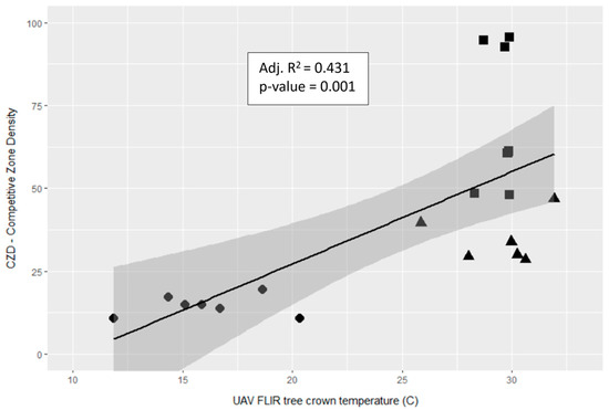 The model had a high degree of correlation (Adj. R2 = 0.783) and identified significant differences between Rx1 and Rx2, and Rx1 and NoRx. As a contributing predictor, Etrans was significant (p = 0.039), but tree-to-tree competition (CZD) was not. Predicting drone-detected crown temperature from only Etrans and CZD was not as effective overall (Adj. R2 0.528, p = 1.94 × 10−10 AIC = 192.83), although a significant correlation between CZD and Td was found when no other attribute was co-analyzed (Figure 9). In this figure, trees in the different neighborhoods are clustered together with the Rx2 and NoRx trees in the same 5–7 °C range, but the Rx2 trees have a significantly lower mean CZD (30.1) than the NoRx trees (71.6).