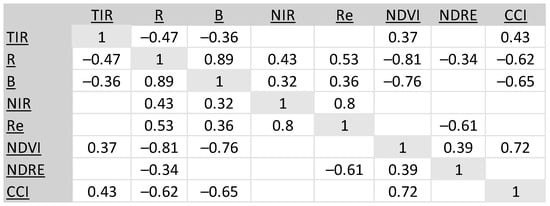 Vegetation indices (VIs) calculated from the multispectral UAV imagery. Band designations: R = red, G = green, B = blue, NIR = near infrared. See Table 4 for specific bandwidth information.