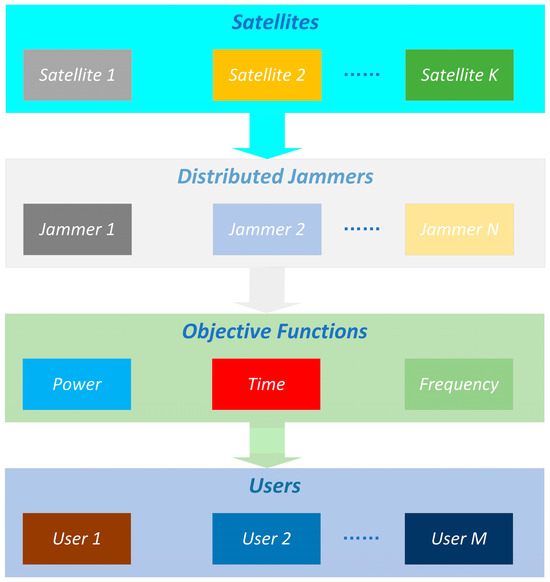 Based on the identification and localization of each satellite within the region, and utilizing the positional information of jammers in the satellite-to-ground link domain, a multi-objective jamming resource scheduling model was constructed, as illustrated in Figure 2. Considering the different deception strategies of distributed jammers in the power, time, and frequency domains, the optimization and coordinated control of distributed deceptive jammers are implemented. This allows for coordinated jamming in the satellite-to-ground links of multiple LEO satellites within the region, disrupting the downlink communication network of the LEO satellite constellation.