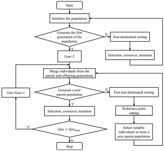 The third-generation non-dominated sorting genetic algorithm (NSGA-III) is an advanced multi-objective evolutionary algorithm designed to address optimization problems with multiple conflicting objectives. It primarily focuses on improving the diversity of solutions and enhancing efficiency to prevent the algorithm from becoming trapped in local optima. The algorithm’s specific process can be summarized as follows: population division into non-dominated levels, the determination of reference points on hyperplanes, adaptive normalization of population individuals, correlation operations, and genetic operations to generate offspring populations. The basic flow is illustrated in Figure 3.