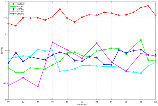 In the performance experiment regarding the solution set, under the same conditions as the objective function optimization test, the NSGA-III algorithm was tested first, followed by comparison with the c-DPEA, MTCMO, MSCEA, and URCMO algorithms. The Feasible-Rate and Spread values for the optimized dominant solution sets were obtained after testing, and they are shown in Figure 7 and Figure 8.