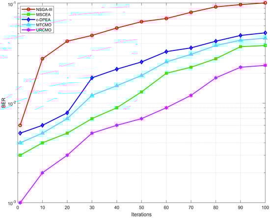 The jamming success rate is the core indicator of jamming optimization. The total receiver bit error rate in a certain area measured according to actual satellite signals was used to reflect the jamming success rate, where a higher bit error rate indicates a higher jamming success rate. In the experiment testing jamming success rate optimization, assuming that LEO satellites send a 1000-bit stream to ground users and under the constraint of at least 90% jamming coverage, the NSGA-III algorithm was tested first, followed by comparison with the c-DPEA, MTCMO, MSCEA, and URCMO algorithms. The changes in the bit error rates corresponding to different optimization algorithms are plotted in Figure 10.