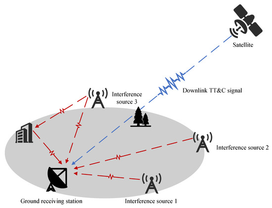 The transmission scenario of the satellite TT&C signal downlink. Ground receiving stations, while receiving downlink TT&C signals, may receive intentional or unintentional interference signals and multipath clutter from ground-based stations. Furthermore, there may be obstacles such as trees and buildings which lead to the submergence of TT&C signals within the ambient signal environment.