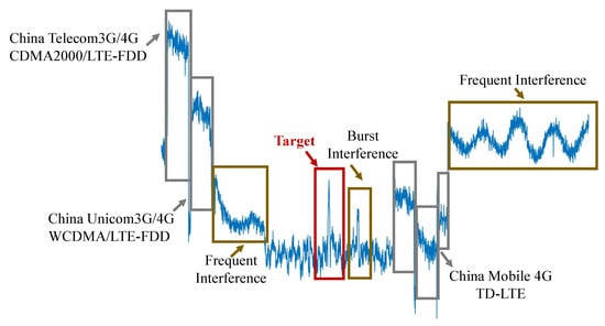 In addition, the downlink channel, often subject to losses like shadowing and multipath fading, results in a decline in SNR. Background interference signals, whether intentional or unintentional, may possess significantly higher energy than the satellite TT&C signal when close to the ground receiving station. Figure 3 illustrates a schematic spectrum received by a ground station in a complex scenario, displaying a wideband spectrum of signals, where the frequency range is from 2100 MHz to 2400 MHz. The scene includes persistent signals from multiple sources, such as 3G and 4G base stations, as shown in Table A1 of Appendix A, making the TT&C signal nearly submerged in the spectrogram. Notably, 3G and 4G signals commonly employ code-division multiple access (CDMA) or orthogonal frequency-division multiple access (OFDMA) [44] technologies, with a wide bandwidth ranging from a few to tens of megahertz. These 3G and 4G signals are reflected in the spectrogram as continuous multi-carrier spectral bands. In contrast, TT&C signals have a narrower bandwidth and often appear as discrete, concentrated spectral bands in specific frequency ranges. As a result, TT&C signals demonstrate modulation characteristics that distinguish them from background signals in the spectrogram. Effective detection can be achieved by observing the spectrogram of the received signal and extracting envelope features.