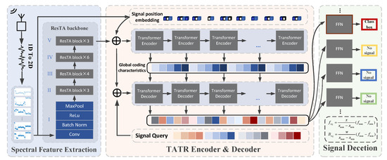 The overall network structure of TATR. This network consists of three parts: ResTA backbone network for spectral feature extraction; neck with multilayer encoders and decoders; and signal detection head block, including class loss and bounding box loss. Firstly, the 1D spectrum amplitude sequence is transformed into a 2D spectrogram and fed into the ResTA backbone. Subsequently, the position embedding of the spectrogram is jointly utilized as input for the TATR encoder and decoder. Finally, the output of the TATR decoder undergoes FFN mapping to derive the positional coordinates and parameter information of the signal.