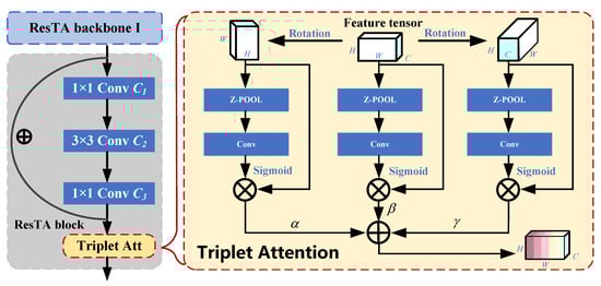 ResNet with triplet attention module (ResTA block). This structure divides the output of each block in ResNet into three channels. These channels then undergo rotation, attention calculation, and stacking to associate signal characteristics across channels, amplitude, and frequency dimensions.
