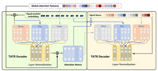 The TATR encoder and decoder is established upon the encoder and decoder architecture of the Transformer model [35]. This structure entirely eliminates CNNs and RNNs, opting for self-attention mechanisms for both encoding and decoding to establish connections among local features in the temporal sequence of signal spectrograms. The architecture of the TATR encoder and decoder is depicted in Figure 6.
