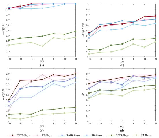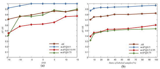 The AR and multiple mAP metrics values show a significant increase with the training epochs, as evident in Figure 8b. TATR achieves an mAP@0.5 surpassing 90% and AR exceeding 80% across all SNRs. Later, we present an ablation analysis to delve into the performance of TATR across various SNRs and the impact of different ratios of labeled training samples.