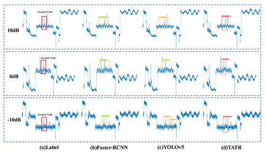 Comparison of signal detection results among different models under different SNRs. (a) Represents the ground truth; (b) represents the detection result of the Faster-RCNN model; (c) represents the detection result of the YOLOv5 model; (d) represents the detection result of the TATR model.