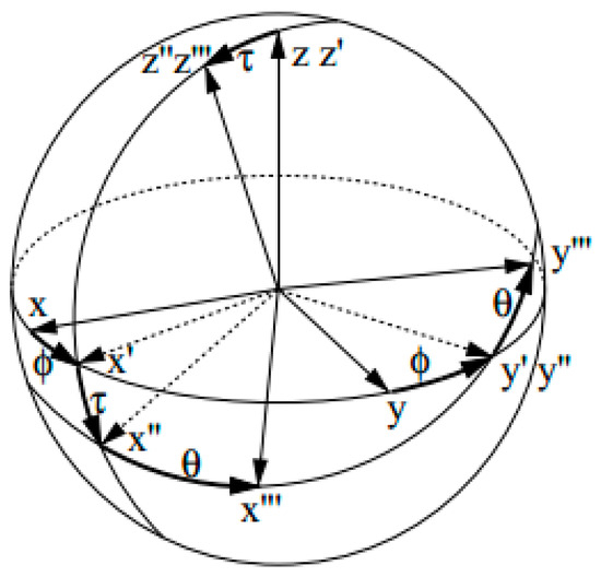 The three angles are referred to as the spin angle ϕ, tilt angle τ, and rotation angle θ. For each rotation, the original axis can be represented as a new axis using a rotation matrix, and the expressions for the three rotation matrices are [50]