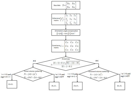 The flowchart of the above adaptive polarimetric target decomposition algorithm (APD) based on A is shown in Figure 3. The specific steps are as follows: