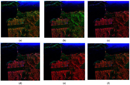RGB syntheses of polarimetric target decomposition algorithm. (a) FRE2; (b) Y4R; (c) MF4CF; (d) HTCD; (e) GRH; (f) APD.