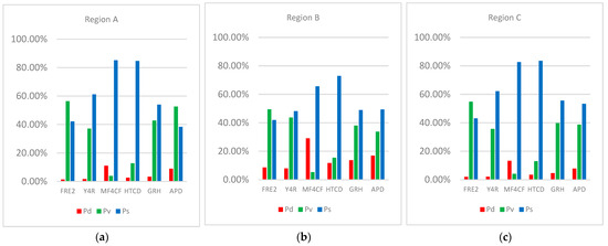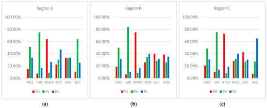 In order to conduct a comprehensive quantitative evaluation of the scattering components, the research team strategically selected three distinct test regions for use in a specific data analysis, as depicted in Figure 7. These regions, each measuring a size of 100 × 120 pixels, are labeled as region A, region B, and region C. Region A is situated in a vast grassland area, region B is located in an urban area, and region C is located on a grassland road. Table 2 shows the percentage of each polarization component for all methods in the three regions. For a more intuitive, clearer view of the results, we transformed Table 2 above into a bar chart, shown in Figure 10. The polarimetric target decomposition components for a range of algorithms are detailed in Figure 10, indicating the percentage of components in each of the three regions.