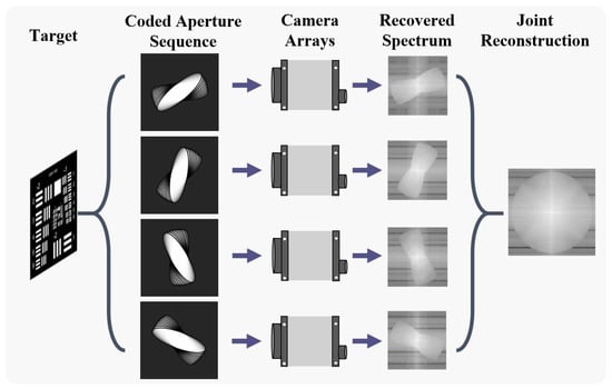 In this study, we considered a table-top miniature laboratory validation model with four cameras (where each camera is equipped with a coded aperture), as shown in Figure 2, as an example to demonstrate the ability of JEFP to reconstruct high-resolution images with high efficiency. By utilizing four imaging subsystems, the target-emitted light waves, which contain the different frequency components of the target information, can be captured from multiple directions. With the implementation of a series of coded apertures, we can generate numerous low-resolution images for each subsystem, obtaining pixel super-resolution by using spectral stitching. In summary, we efficiently fuse reconstructed pixel super-resolution images obtained with individual sub-apertures with joint encoding to achieve higher spatial resolution.