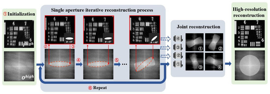 - Repetition of the updating process: Steps 2 to 4 are repeated for all acquired low-resolution images, which is considered completing one iteration.