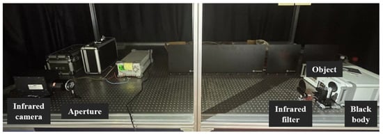 As shown in Figure 7, we built an infrared imaging system and simulated the imaging effect of the camera array by controlling the movement of the imaging target. We used a blackbody as the illumination device, which had a 60 mm diameter aperture and was able to provide a temperature adjustment range of 0–500 °C, a stability accuracy of ±1 °C, a radiation coefficient of 0.97 ± 0.01, and a radiation wavelength of 2–14 µm. The imaging system consisted of a detector (SOFRAFDIR; France; 320 pixels × 256 pixels, 30 µm pixel pitch, medium infrared band) and an infrared imaging lens (f = 100 mm, F/#2, film coating of 3–5 µm). In order to enhance the temporal coherence of the system, we set up a narrowband filter with a center wavelength of 4020 nm and a bandwidth of 150 nm. The negative USAF1951 resolution target placed at the blackbody exit was used as the experimental sample.