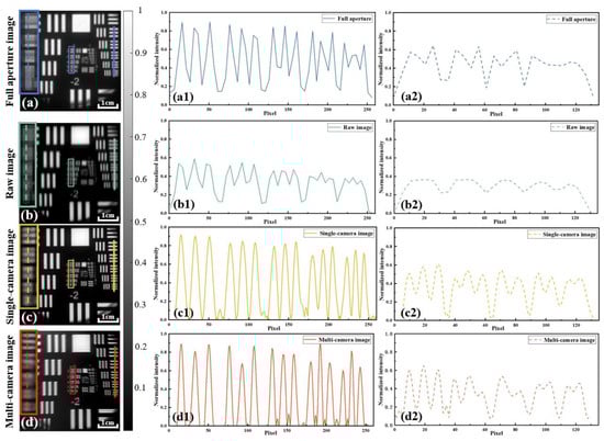 In addition, the result obtained by using multiple cameras could resolve group 0 element 4 (353.55 µm periodicity, corresponding to 40.30 µm imaging resolution) in Figure 8d. Compared with the raw and full-aperture images, we can see that the results still provided a consistent resolution improvement in the orthogonal direction, a 1.59-fold improvement, and better performance in terms of line-pair contrast. It is worth noting that this recovery method is based on the quadrupling of the temporal resolution of the entire acquisition setup (i.e., for each camera, the number of data acquired becomes one-fourth of the original total).