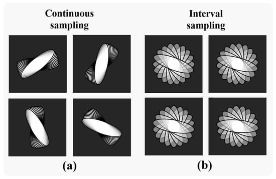Further, we explored the effect of different multi-camera co-sampling methods on the recovery results. The multi-camera results in Figure 8d were obtained by using a continuous-sampling method, i.e., each camera captured a low-resolution image under continuous aperture rotation, as shown in Figure 9a. For the joint multi-camera reconstruction interval-sampling experiment, the sampling method is shown in Figure 9b.