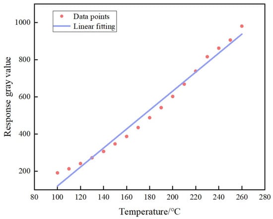 In addition to spatial resolution, temperature accuracy is also an important parameter for infrared-band planetary detection, which helps us explore the mysteries of the universe [35]. Therefore, we verified the temperature accuracy of the proposed method by collecting 17 data points for temperature calibration and fitted the calibration curve of the working range, as shown in Figure 11. In our experiments, the temperature of the blackbody was set to 200 °C, and based on the above-mentioned temperature calibration curve, the corresponding temperature for the captured image was calculated to be 195.54 °C (error of 2.23%).