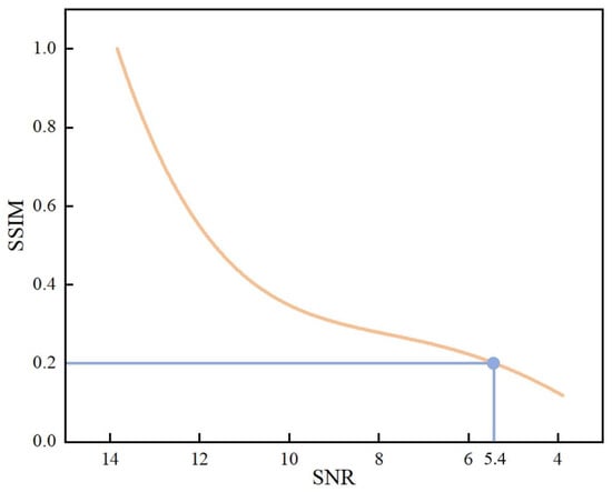 - SNR: We carried out simulation experiments on low-resolution images under different noise conditions and obtained the corresponding reconstruction results. Taking the noiseless condition as a reference, the reconstruction results were evaluated in terms of the structural similarity index (SSIM) for image quality, as shown in Figure 12. When the SNR of the image was close to 5.4, the structural similarity of the reconstruction result decreased to below 0.2, and the reconstruction quality was unacceptable. It can be seen that the proposed method has certain requirements relative to the SNR of the captured images. Therefore, our subsequent work will focus on how to further improve the SNR of the infrared system.