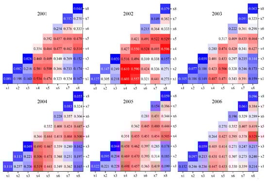 q-value of the extent to which the drivers affect the EEQ under the interaction. x1: elevation; x2: population density; x3: night-time light; x4: annual precipitation; x5: soil sand content; x6: river network density; x7: average annual temperature; x8: density of built-up area.