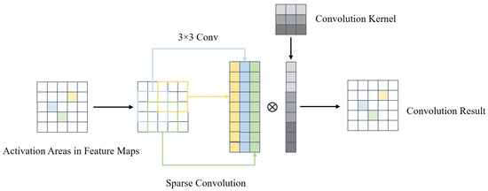 Traditional convolution treats each position in the input equally. However, for sparse data, this approach results in a significant waste of computational resources. Thus, how to reduce unnecessary computations has become a focus of research. The authors of [26] were the first to introduce sparse convolution, which reduces the computational cost of convolution by discarding the computation of irrelevant locations in sparse input data. To address the reduction in sparsity caused by convolution, Ref. [27] proposed a new approach named the submanifold sparse convolutional network. The output location is activated only when the corresponding input location is valid. This method avoids the generation of too many active locations. Methods like [28,29,30,31] accept dense data and trim unimportant portions based on masks to achieve efficient inference.