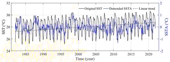 We use SST data from the NOAA Optimum Interpolation SST (OISST) v2.1 constructed by combining observations from different platforms including the Advanced Very High Resolution Radiometer (AVHRR) satellite data, ships and buoys []. The data spatial resolution is 0.25°, and its temporal resolution is daily. The OISST dataset employed in this research spans 40 years from 1 January 1982 to 31 December 2021. Our study area is the SCS of 0°–24°N and 99°–121°E. Since the forecast of the SCS SST is based on spatiotemporal deep learning models with EOF analysis, choosing the whole SCS basin as the target region will ensure that the obtained patterns are optimal spectral decomposition results for such an enclosed basin with the Sulu Sea excluded []. The SST anomalies (SSTAs) are actually preferred instead of SSTs themselves in the following modeling process; thus, detrended time series of the SST data are generated for each of the total 4758 grid points within the study area after the removal of cyclic component like the climatological seasonal cycle [] and the warming trend of the SST in the SCS basin [,]. Figure 1 shows the original SST and detrended SSTA averaged over SCS during 1982–2021.