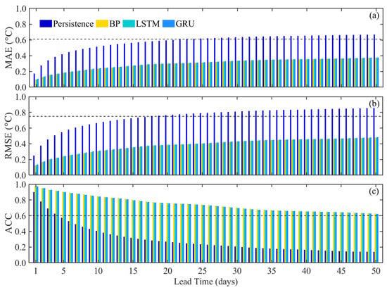 Averaged (a) MAEs (°C), (b) RMSEs (°C) and (c) ACCs for the SCS SSTA forecasts at lead times of 1–50 days generated by persistence (dark blue bars), BP (yellow bars), LSTM (green bars), and GRU (light blue bars). The black dashed line in (a,b) indicates the climatology (~0.61 °C and ~0.75 °C) of the basin-wide SSTA for the period 1982–2021, and the black dashed line in (c) is an ACC of 0.6, which is a rule of thumb for measuring “usefulness” of predictions.