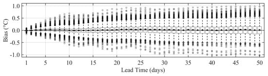 Figure 4 shows the boxplots of the bias as a function of forecast lead time for the daily SCS SSTA forecasts. The dot in each box denotes the mean value, while box limits indicate the range of the central 50% of the bias, with the central line within the box marking the median and the circles above and below the whiskers representing the outliers that are either above 99.5th or below 0.5th percentile. As expected, the spread of the bias shows a tendency for increasing with increasing lead; and such increasing tendency becomes slow at lead times longer than ~15 days in terms of both interquartile range (box) and whiskers (dashed lines). The 99% forecast bias remains within the range of approximately −0.57 °C to 0.59 °C at the end of the 50-day forecast window. The daily SCS SSTA forecasts are warm biased, according to the medians (or means), just a little bit, with relatively large values (less than 0.04 °C in terms of median or mean) observed in the middle of the forecast range, i.e., at lead times of 20–35 days. It is clear that more warm outliers than cold ones exist at the lead times longer than one day.