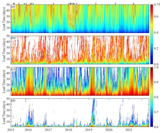Daily RMSEs (°C; a,b) and ACCs (c,d) of the SCS SSTA forecasts produced by the BP model (a,c) and persistence (b,d) at lead times of 1–50 days for the period 2015–2021. The blank areas in (a,b) indicate RMSEs are larger than the climatology (~0.75 °C), and those in (c,d) indicate ACCs smaller than the threshold of 0.6. Black arrows at the top panel point to the blanks.