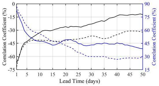 The smaller (larger) the RMSE (ACC), the better the model fits the truth. As shown in Figure 5, for forecast lead times less than a few days, small daily RMSEs always correspond to large ACCs for the BP model and persistence forecasts, and vice versa. This can be further identified by the fact that, at a forecast lead time of one day, the correlation coefficient between RMSE and ACC time series from the BP model (persistence) is ~67% (~72%), as indicated by the black solid (dashed) line in Figure 6; it then goes down quickly with increasing lead for the first few days, especially for the BP model forecasts. At a forecast lead time of five days, for example, it drops to ~43% (~44%) for the model (persistence) forecasts. After that, the correlation between the RMSE and ACC time series produced by the persistence remains almost unchanged (~42%) at forecast lead times shorter than ~20 days and then decreases with forecast lead time at a relatively slow rate and reaches ~32% at the end of the forecast window. For the model forecasts, the correlation between the RMSE and ACC time series slowly reduces to approximately 13% at a forecast lead time of ~41 days, and then stays almost unchanged till the end of the forecast window.